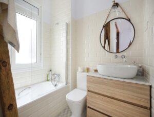 - Mobiliario funcional: Mueble de baño a medida en acabado madera, suspendido para facilitar la limpieza y con gran capacidad de almacenamiento.